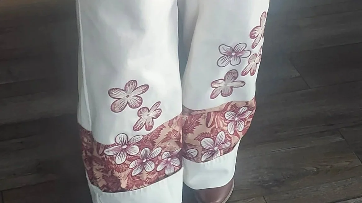 This project started with a super cute pair of cropped wide-leg capris that did not look quite right. So we modified them with a little fabric and some cute flower applique embroidery… Take a look.